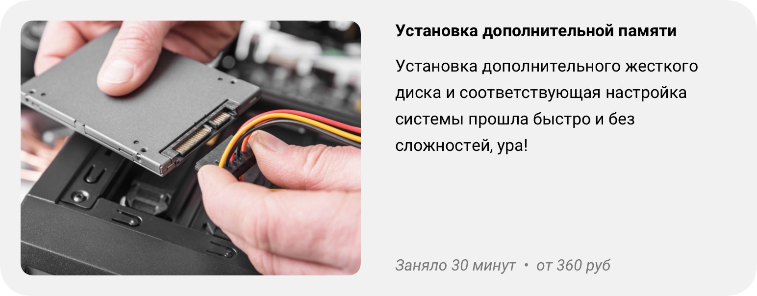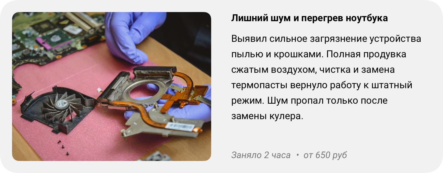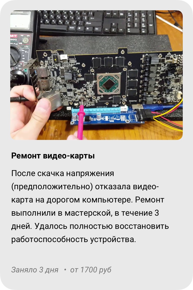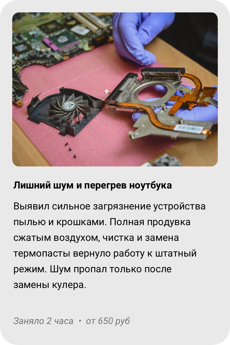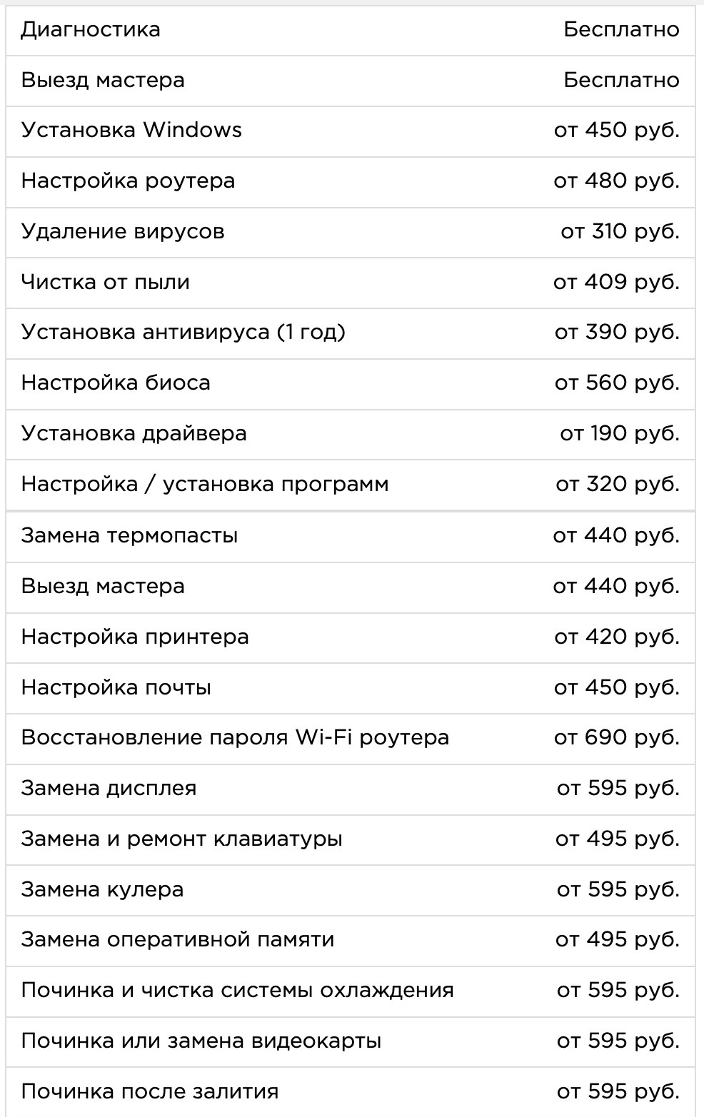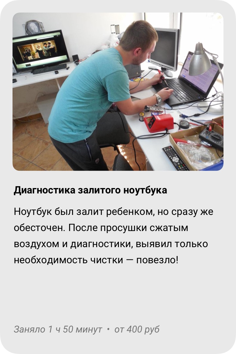 Широкий спектр услуг, связанных с компьютерами и другой электроникой. Это может включать в себя диагностику и ремонт компьютеров и ноутбуков, установку и настройку программного обеспечения, устранение проблем с сетью, восстановление данных, замену комплектующих и многое другое.