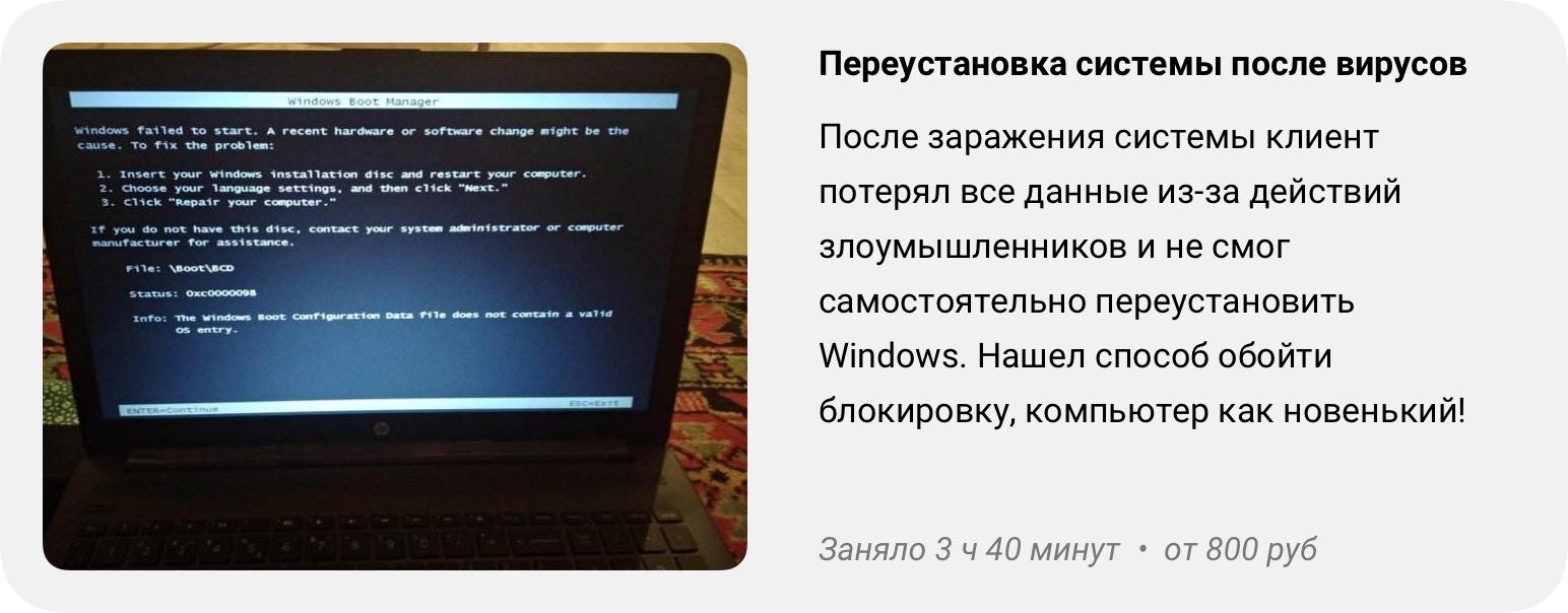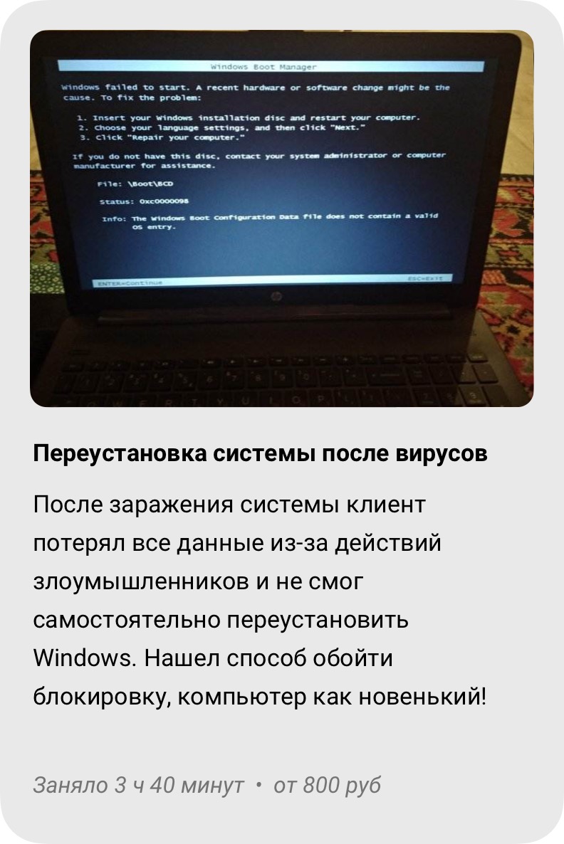 Я ориентирован на то, чтобы вам все понравилось и вы обращались только ко мне. Гарантирую сохранность данных и даю гарантию до года на свои работы.