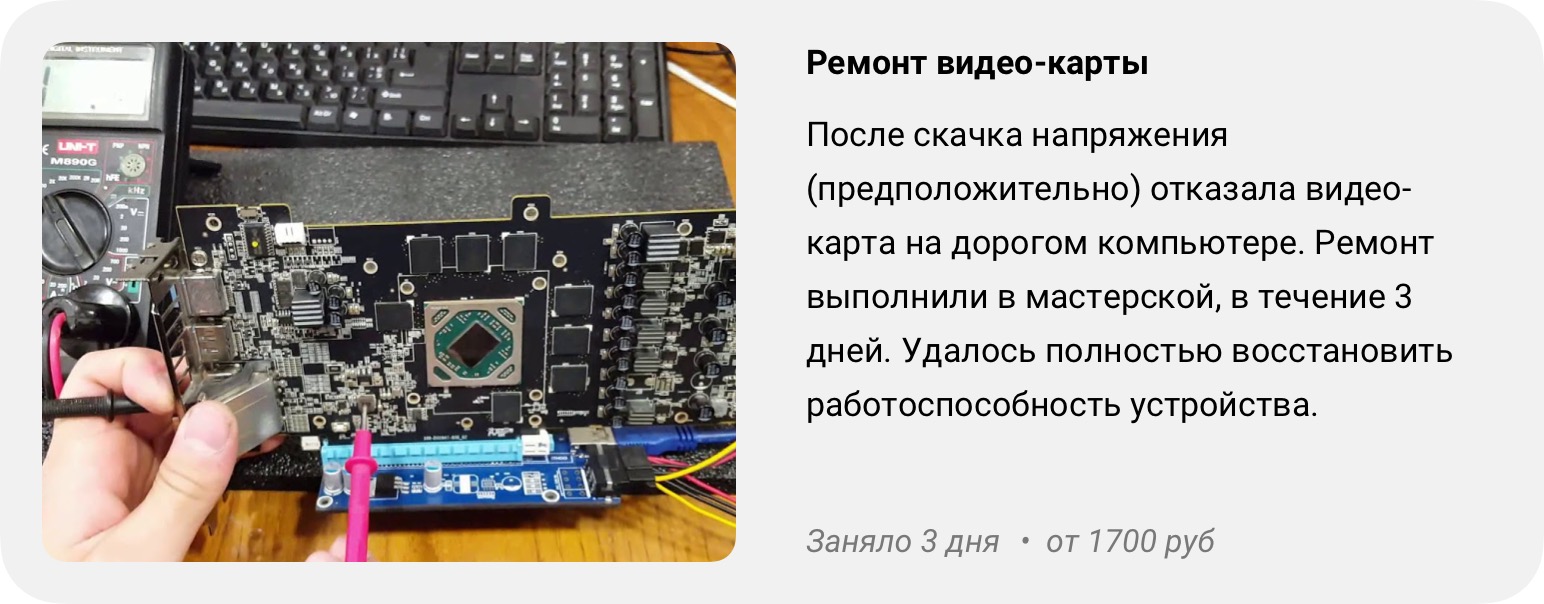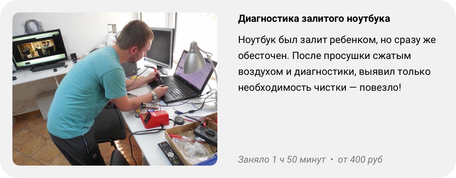Почти всегда удаётся сделать ремонт на месте. Стоимость зависит от сложности — об это сообщу перед началом работу. Редко возникают доп сложности.